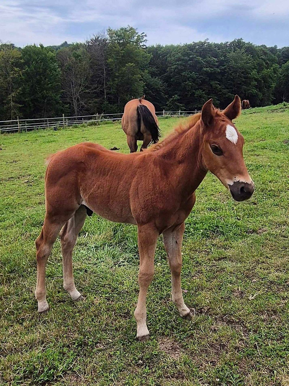 Né le 3 mai 2024, ce magnifique poulain présente un modèle idéal : bien bâti, dos court, léger et athlétique. Son intelligence précoce et sa vivacité laissent présager un bel avenir.